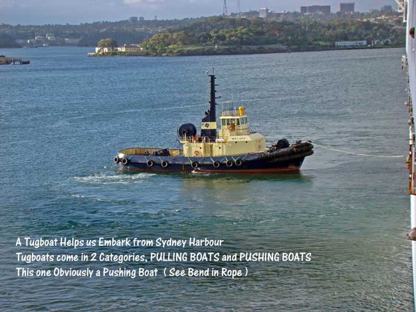 A Tugboat Helps us Embark from Sydney Harbour Tugboats come in 2 Categories, PULLING BOATS and PUSHING This one Obviously a Pushing Boat ( See Bend in Rope )