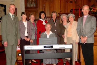 Pictured at the dedication of a new digital piano is L to R: Ivor Ferguson, Elizabeth Bridgett, Phyllis Spence, Janet Ferguson (Director of Music), Edith McConnell, Norma Coggins, Anthea Harrison, the Rev Brian Gibson and organist Dr Bertha Cowan (seated at the piano.)