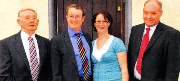 Rev Gareth McFadden pictured with his wife Michelle at Drumlough manse prior to his Installation Included are Anahilt Clerk of Session Mr Rex McClelland (left) and Drumlough Clerk of Session Mr David Gibson (right).