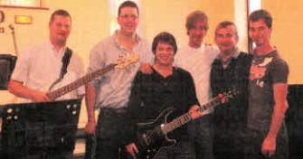 Maghaberry Elim pastor, Mr Brian Madden, second from right, welcomes the well-known Gospel rock band lnflame to the church for a concert to mark the finale of the fellowship's highly successful summer schemes.