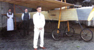 | Mat McElhinney plays the young Harry Ferguson in his trademark white Linen suit in The Man Who Could Fly. US4409- | Eddie Irvine ponders the amazing story of how Harry Ferguson was the first man in Ireland to fly. US4409- |