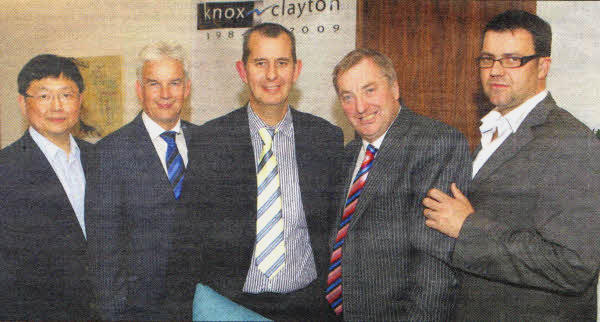| Environment Minister Mr Edwin Poots MLA, joins Knox & Clayton partners, Jiradej Ermongkonchai, Desmond Clayton, Ernest Knox and Lawrence Power at their 25th Celebration in the Presidents Club, Belfast. |