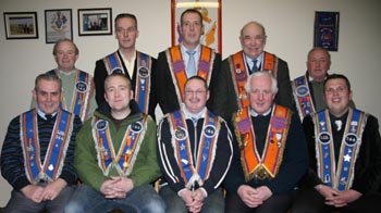 At a meeting of Lord Arthur Hill Memorial LOL 144 held in Arthur Street Orange Hall, Hillsborough on Wednesday 21st January, the installation of office bearers was conducted by Bro Alan Finn (Worshipful District Master) and Bro James Magee (Deputy District Master) of Hillsborough District LOL No 19. Newly appointed office bearers and committee members for 2009 are as follows: Bro Rodney Turkington (Worshipful Master), Bro Robert Hanna jnr (Deputy Master), Bro Andrew Ewing (Chaplin), Bro Charlie Campbell (Assistant Chaplain), WBro Harry Shortt PM (Secretary), WBro Francis Hughes PM (Treasurer), WBro Alan Finn PM WDM (First Committee), Bro Raymond Finn (Second Committee), WBro Robert Davis PDM (Third Committee), Bro Harry Riddle (Fourth Committee), WBro Robert Hanna PM (Fifth Committee) and WBro Mark Riddle PM (Lecturer).