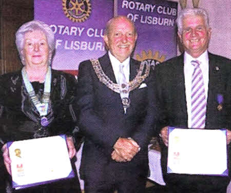 The Paul Harris Fellowships are presented to Norma Coggins and Billy Rogan by outgoing president of the Rotary Club of Lisburn, John Mcllroy.