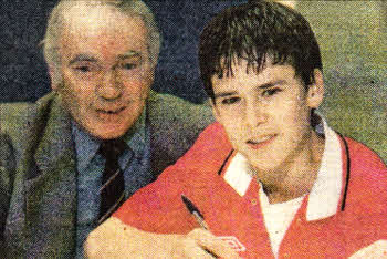 Eddie with 14-year-old David Healy when he signed for Manchester United from Lisburn Youth.