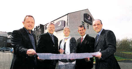 First Minister Peter Robinson and Minister of the Environment Edwin Poots join Andy Orr and Jill Moore of Premier Inn, and Des Taggart of Conway Group to review plans for a £2m extension of Premier Inn Lisburn.