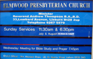 The present minister, the Rev. Andrew Jonathan Thompson, previously in Craigavon and Vinecash, was installed in Elmwood on Monday 14th June 2004.