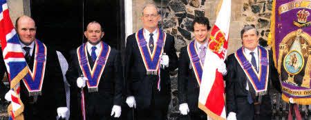 Magheragall District Royal Arch Purple Chapter No 9 Colour Party who led the procession. L to R: Bros - Peter Simpson, William Hobson, John Gray, Samuel Gordon and William Dougherty