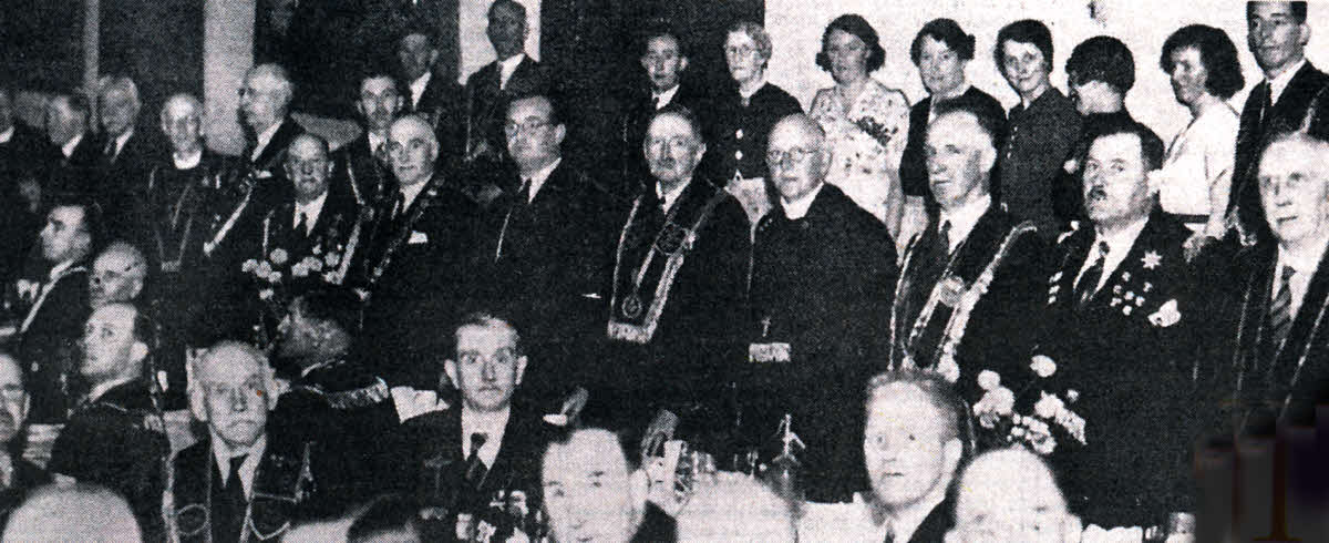 Luncheon in Lisburn Orange Hall between sessions of the half-yearly meeting of the Imperial Grand Black Chapter in June 1939, prior to the outbreak of the 2nd World War. (lt is believed to be the first time that this meeting was held in Lisburn Orange Hall). Included are Sir William Allen (Chairman), John D Barbour (Chairman of Lisburn Urban Council) and Sir Knts - R Briggs (DGM Liverpool and Provincial GM of England), H A Cushnie (Assistant Grand Registrar), Cecil Lowry-Corry (Grand Treasurer) and JA Barlowe (Assistant Grand Treasurer).